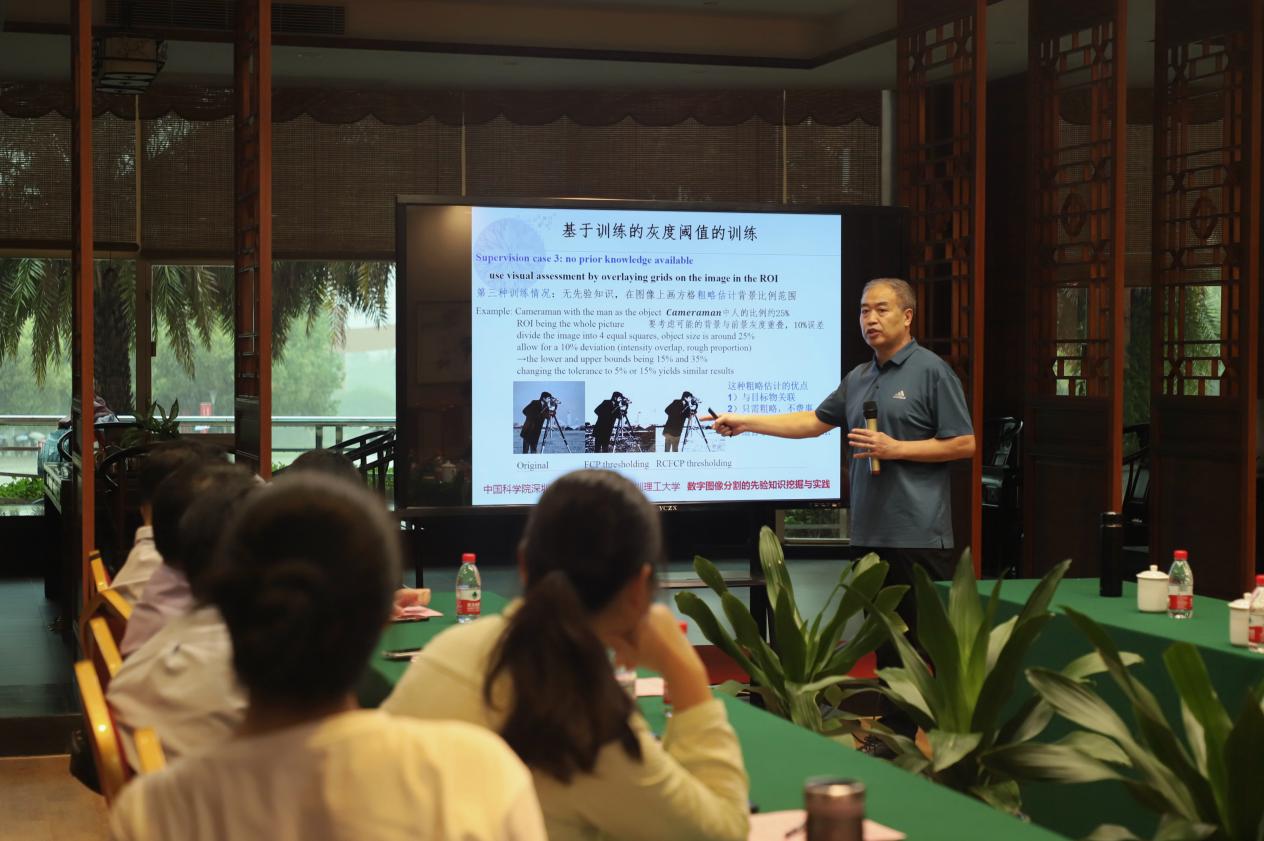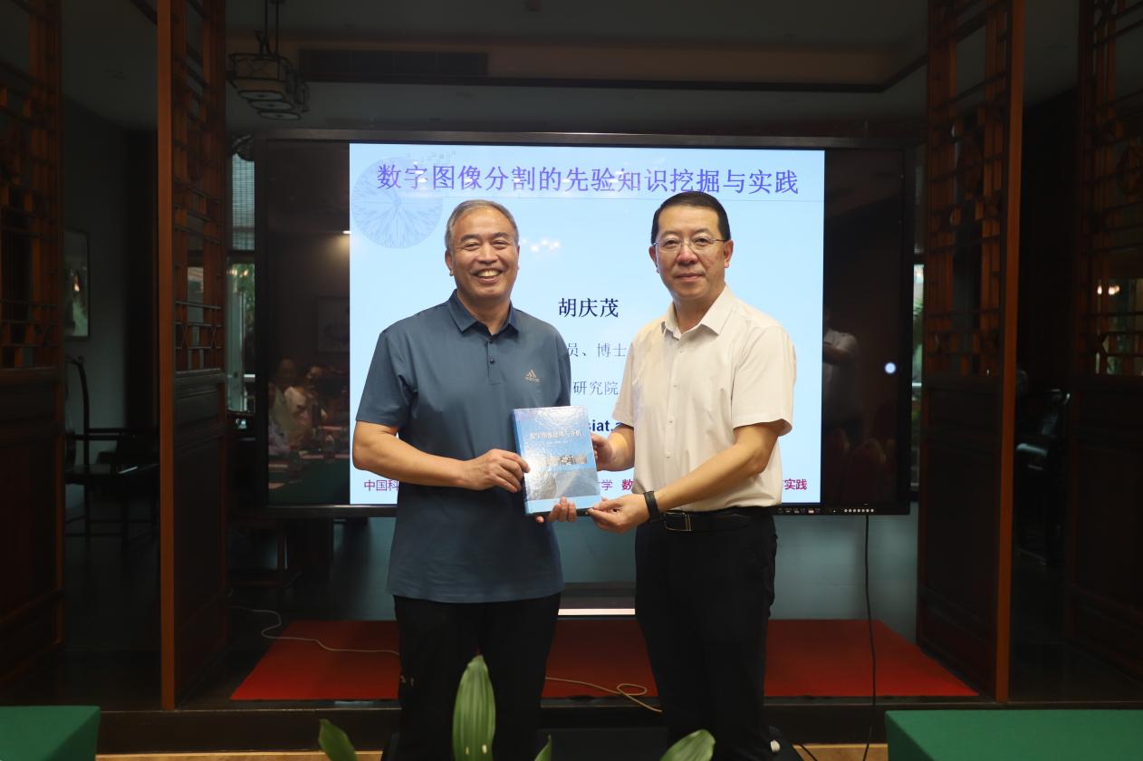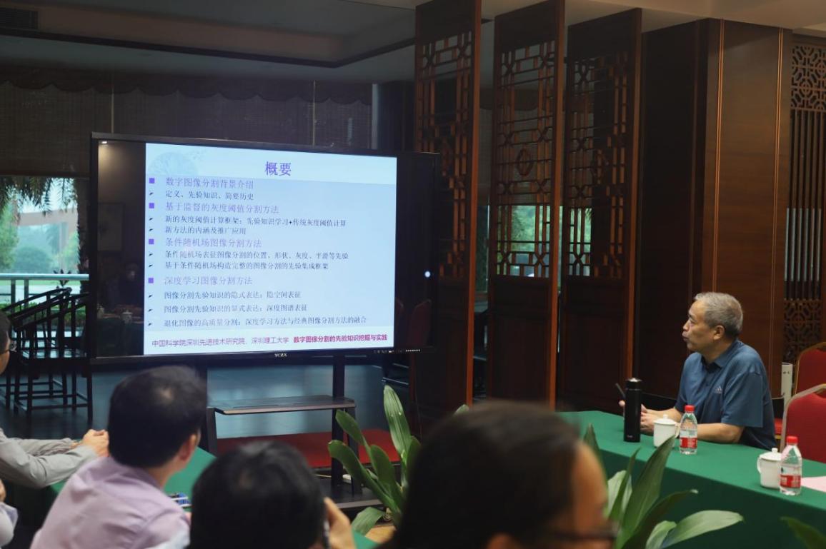 随后,胡庆茂教授作了以“数字图像分割的先验知识挖掘与实践”为题的学术报告。他围绕“先验知识”展开,以通俗的语言和直观的案例梳理了数字图像分割的背景,并介绍了三种分割方法,即基于监督的灰度阈值分割方法、条件随机场图像分割方法以及深度学习图像分割方法。
