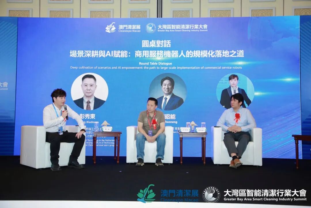 随后的圆桌对话是以“场景深耕与AI赋能:商用服务机器人的规模化落地之道”为主题,彭秀东教授与清洁行业技术精英,围绕商用清洁机器人场景适配、技术突破、成本控制及规模化落地等核心问题展开深入探讨。他们一致认为,AI赋能清洁行业的核心与关键在于场景深耕,只有贴合清洁行业的实际作业场景,解决实际问题的技术与设备,才能真正实现商业化应用与规模化发展。